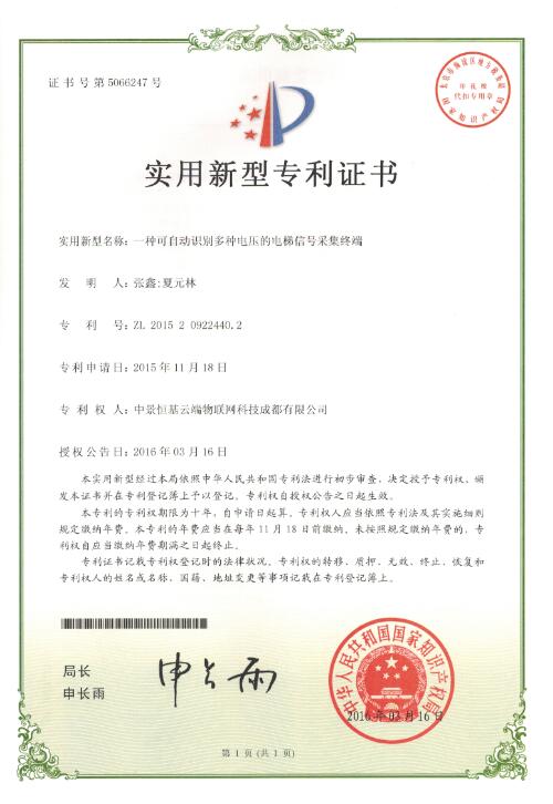 本網(wǎng)訊(通訊員 張鑫)近日,集團(tuán)旗下中景恒基云端物聯(lián)網(wǎng)科技成都有限公司獲得兩項(xiàng)國家知識產(chǎn)權(quán)局頒發(fā)的專利證書,分別是“一種可自動(dòng)識別多種電壓的電梯信號采集終端”和“一種用于電梯的多功能物聯(lián)網(wǎng)終端”。