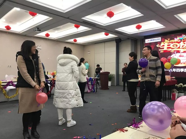 會(huì)場(chǎng)懸掛拉花,并以五彩斑斕的氣球作為點(diǎn)綴,除此之外,工會(huì)同事還準(zhǔn)備了多種水果、飲料、生日蛋糕以及小禮品送給各位壽星與新人。別具一格的布置創(chuàng)意增加了喜慶的氣氛,便于壽星們和新人們交流感情以及完成游戲。